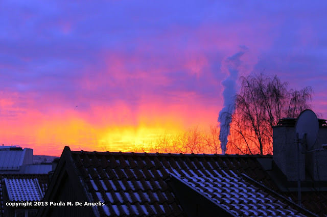 A few days ago, I witnessed an exceptionally colorful and fiery sunrise. I snapped some photos as I often do, and right before I was to leave for work, the rising smoke contrasted against the sky looked as though it had caught fire. I got some photos of this as well. Thought you might like to see them!